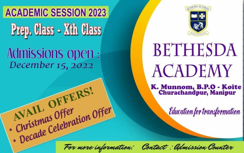 Leave a Comment / News / December 29, 2022 / 1 minute of readingAdmissions are open for prep class for Xth Class for academic session of 2023. Enroll now to avail Christmas Offer and Decade Celebration Offer.Contact at Admission Counter of Bethesda Academy, K. Munnom, BPO Koite, Churachandpur, ManipurShare this:Click to share on Twitter (Opens in new window)Click to share on Facebook (Opens in new window)Click to share on LinkedIn (Opens in new window)Click to share on Tumblr (Opens in new window)Click to share on Pinterest (Opens in new window)Click to email a link to a friend (Opens in new window)Click to share on Reddit (Opens in new window)Click to share on WhatsApp (Opens in new window)Click to print (Opens in new window)Like this:Like Loading...